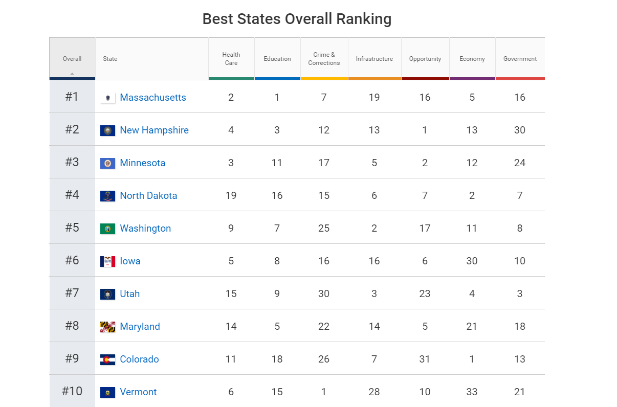 This week, U.S. News and World Report released its brand new “Best States” list, ranking the 50 U.S. states based on 68 metrics from several broad categories such as health care, education, and infrastructure, with Massachusetts leading the way at #1. The project is powered by a Leading States Index developed by McKinsey & Company, which has extensive experience in consulting focused on the improvement of state governance.